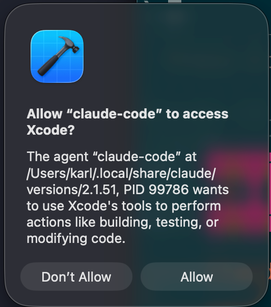 Claude Code Cli 에 Xcode 가 지원하는 MCP로 접속을 하게 되는 경우, Xcode 에서 접속을 수락할 것을 확인하고 수락을 하면 아래와 같이 Claude Code Cli 에서 XCode 에 접속 된것을 확인 할 수 있습니다.